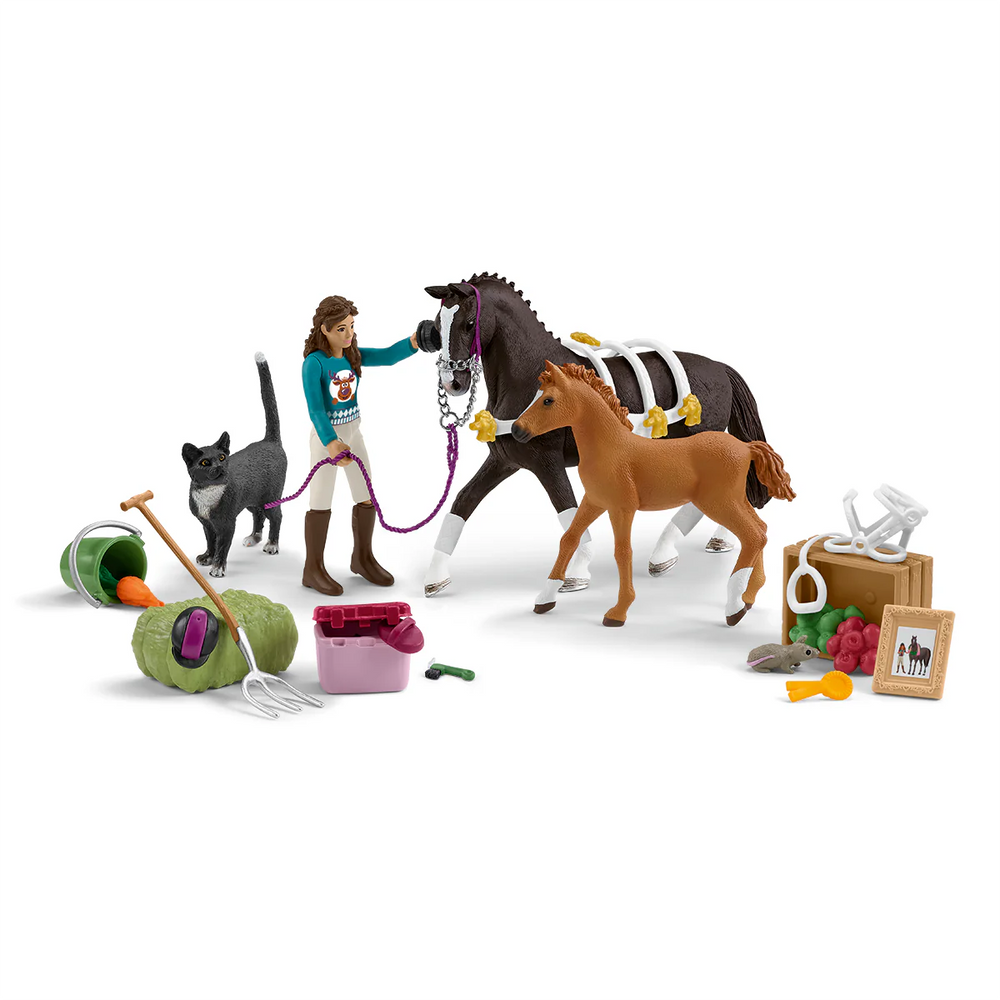The Advent Calendar from HORSE CLUB offers 24 great surprises for real horse fans! Whoever opens all the little doors, gets to put the white crampons on the mare and help her into the bridle. Together with Sofia we head to our training session. The foal watches and sniffs everything with interest. For a moment, it even forgets the crunchy carrot that's waiting in the bucket.