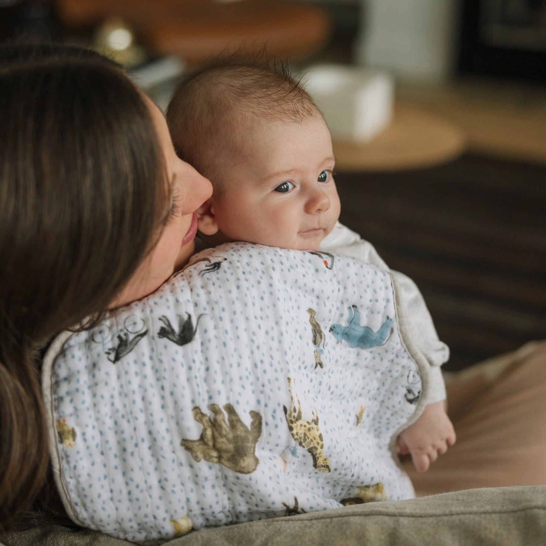 There's no use crying over spilled milk! With 4 absorbent layers of cotton muslin and an innovative shape, this burp cloth keeps you clean and dry while baby's snuggled tight.
