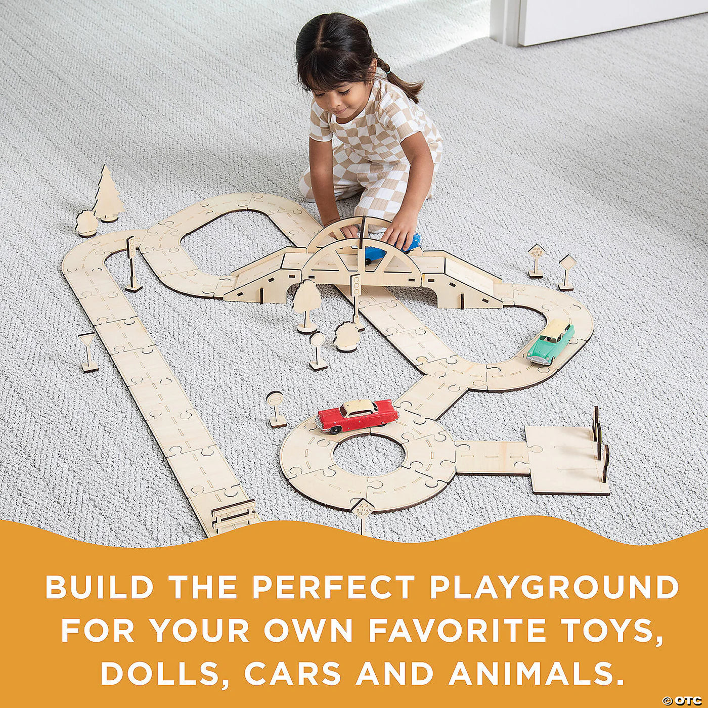 Bring imaginative roadways to life! Crafted for little hands, this Montessori-inspired collection contains chunky, easy-to-handle wooden building pieces that easily fit together in any position they choose, allowing kids to build one-of-a-kind roadways complete with a wooden bridge, trees, parking lots and more. With over fifty 3 1/2” wide road pieces ranging in length from 6 1/2” to nearly 13”, this large-scale set is the perfect background for zoom kids’ favorite toy cars all around the town they built! Children will not only have fun but also learn as they play, enhancing fine motor skills, problem-solving abilities and creative thinking. Featuring a natural wood finish, children can also paint, color and decorate each piece for an extra touch of creativity and unique style. Ideal for caregivers and educators looking to engage children in meaningful, screen-free play, this set offers hours of educational entertainment. Encourage the joy of learning through play by gifting this versatile building set to the imaginative children in your life!