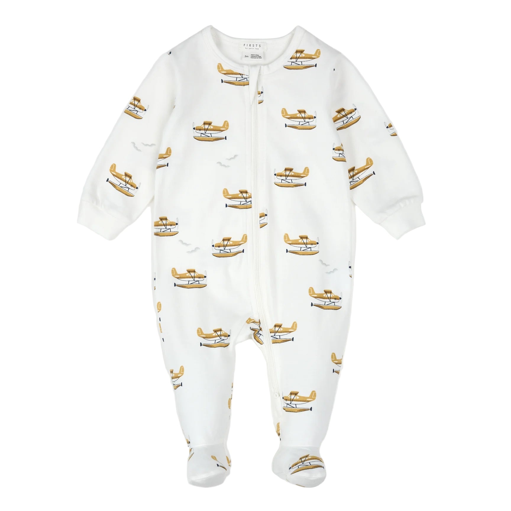 Send him soaring into dreamland with this cozy yet cool Seaplane print sleeper. Made with organically grown cotton jersey, the sleeper has the comfort and stretch they need to explore and snooze. With a two-way zip, the sleeper makes changing as easy as an ocean breeze while the integrated feet and ribbed cuffs ensure he’s warm yet free to play and explore.