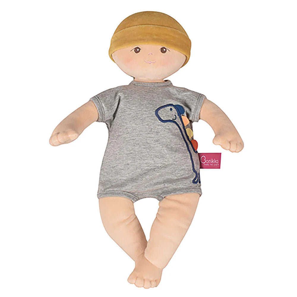 Kye is an organic, handmade doll and has a soft and huggable body. He has a grey baby onesie on with dinosaur embroidery. Kye baby boy doll has a mustard yellow hat on to really set off the outfit.