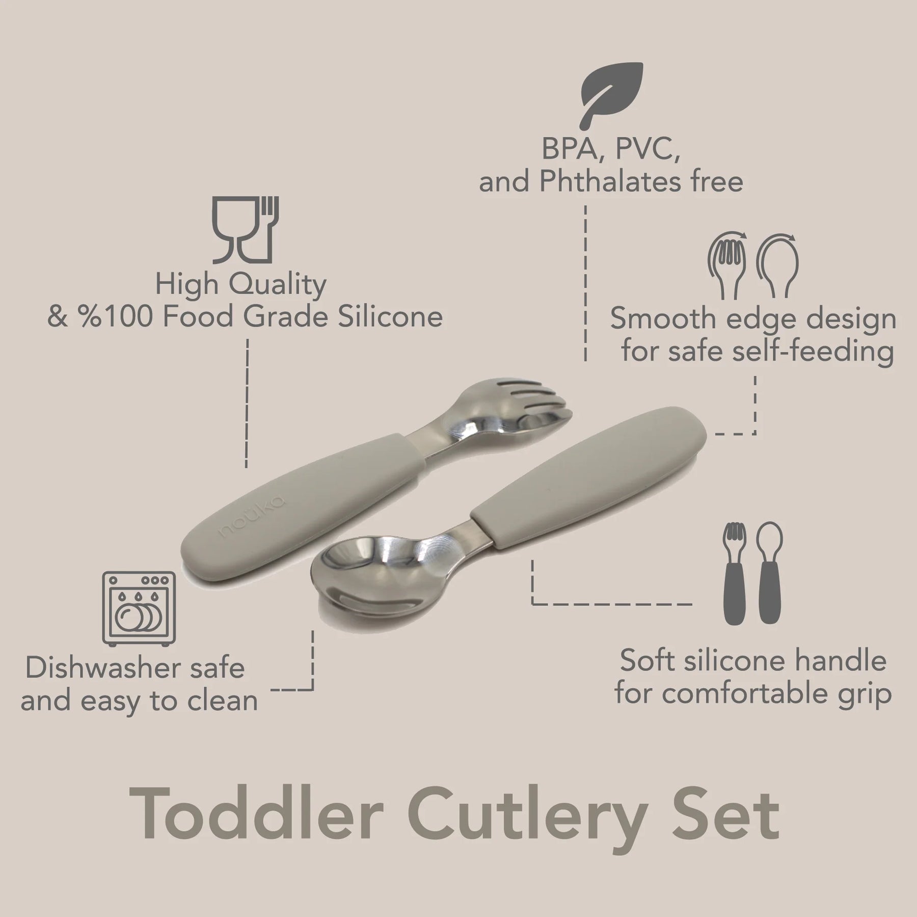 Self-feeding is simple and safe for little ones with noüka’s Toddler Cutlery Set. This set includes a fork and spoon with smooth edge design for safety. The soft silicone handle allows for a comfortable grip as they practice self-feeding. Made from food grade silicone and stainless steel that is dishwasher safe, this dinnerware set is easy to clean, durable, and long-lasting. The Toddler Cutlery Set is available in an array of calming, modern colours for your little one.