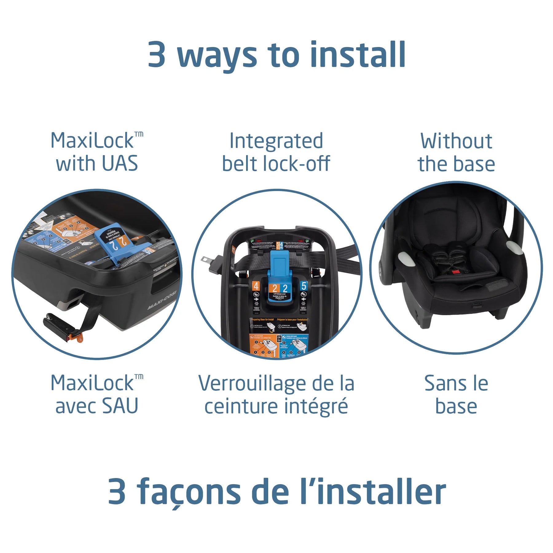 - Includes a convenient stay-in-car base featuring MaxiLock™ technology with 3 adjustable positions, self-tightening UAS system, and load leg which adds stability and limits movement in the event of a collision