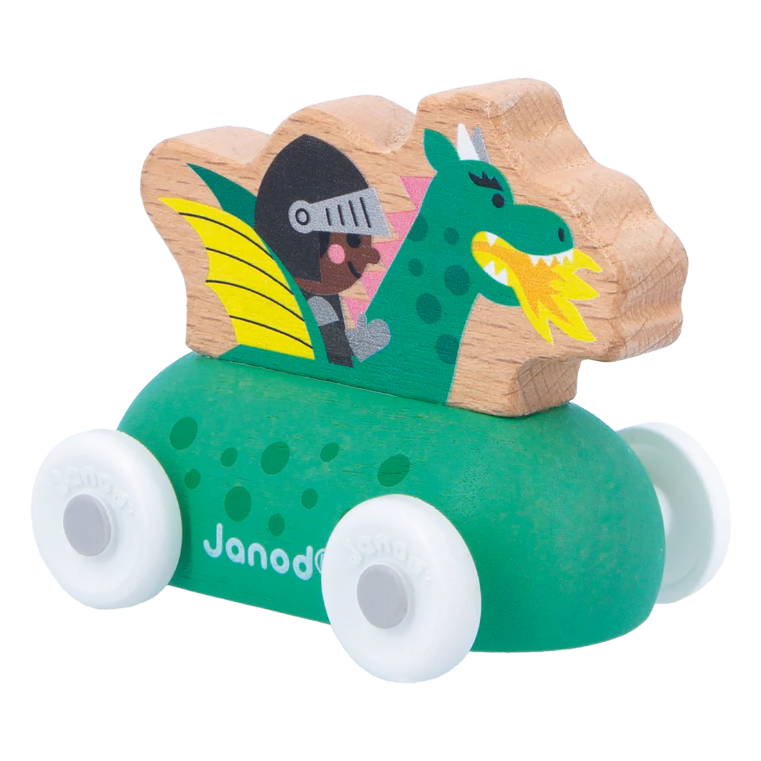 The Janod Wooden Dragon Car – Enchanted Kingdom – Cross Roads is a wooden toy designed for children aged 12 months and up. This small green car is easy to handle thanks to its design, allowing little ones to grasp it from the top to roll it. It's perfect for inventing various magical stories, promoting imagination and motor skills development.