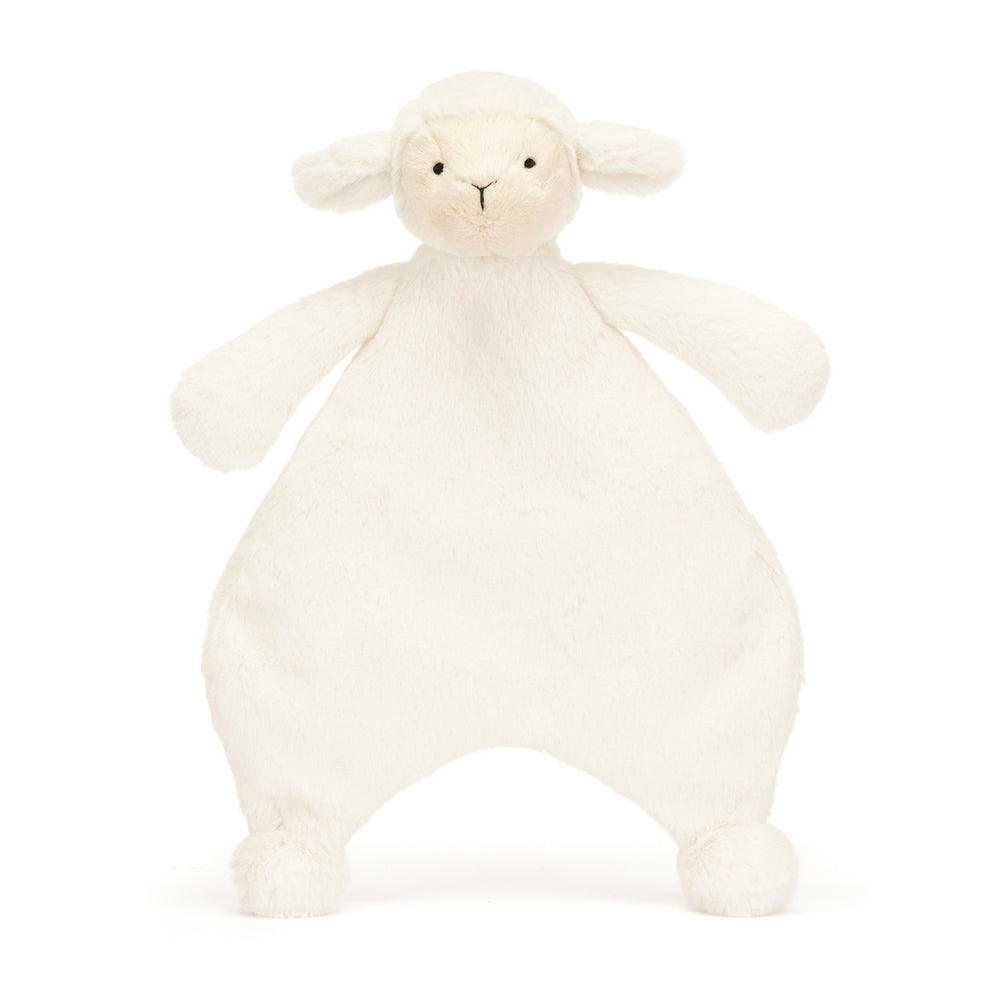 A gorgeous first gift for newborns, the Bashful Lamb Comforter is cloudy-soft in a delicate vanilla cream fur made with recycled fibres. Designed for calming cuddles with an un-stuffed tummy yet squashy soft hands and feet. With cute waggle ears and embroidered face features, this sweet lamb is a present to treasure.