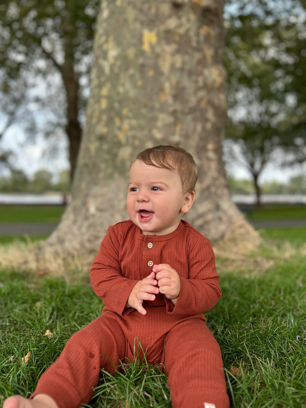 This Rust Mason Rib Romper is the perfect way to dress your little one in stylish comfort. With a snug, ribbed fit and classic nautical vibes, you can count on that special someone looking sharp and feeling cozy!