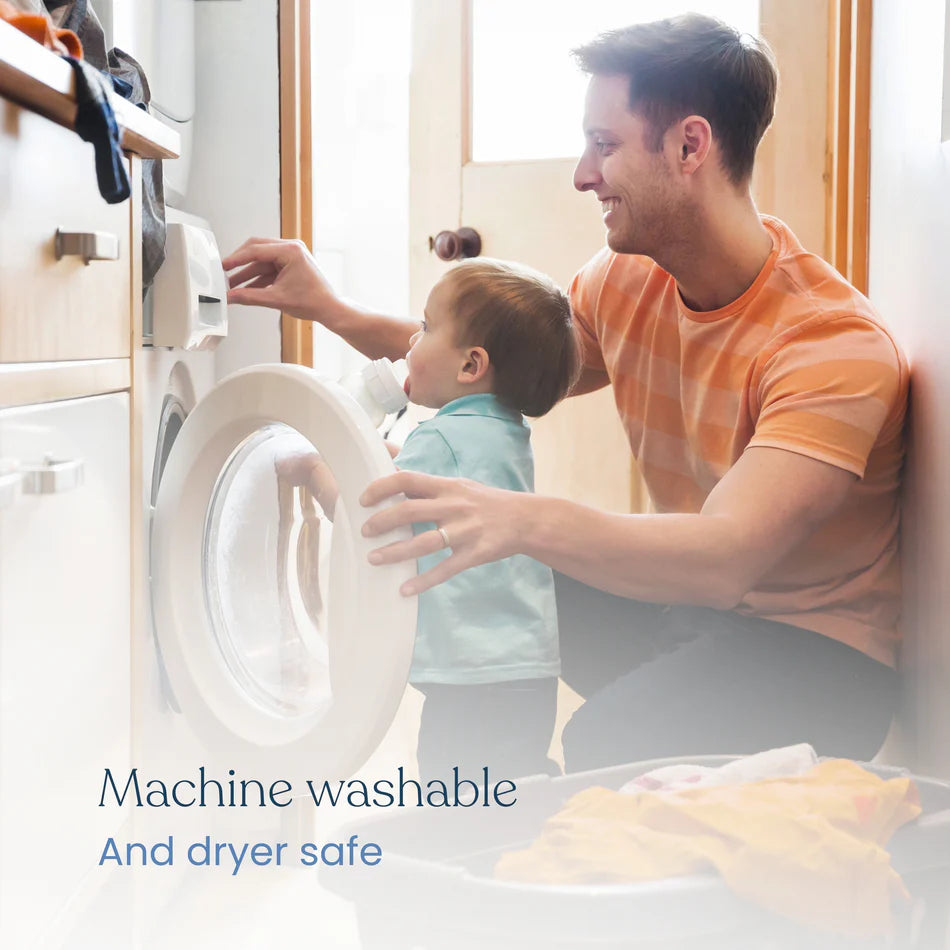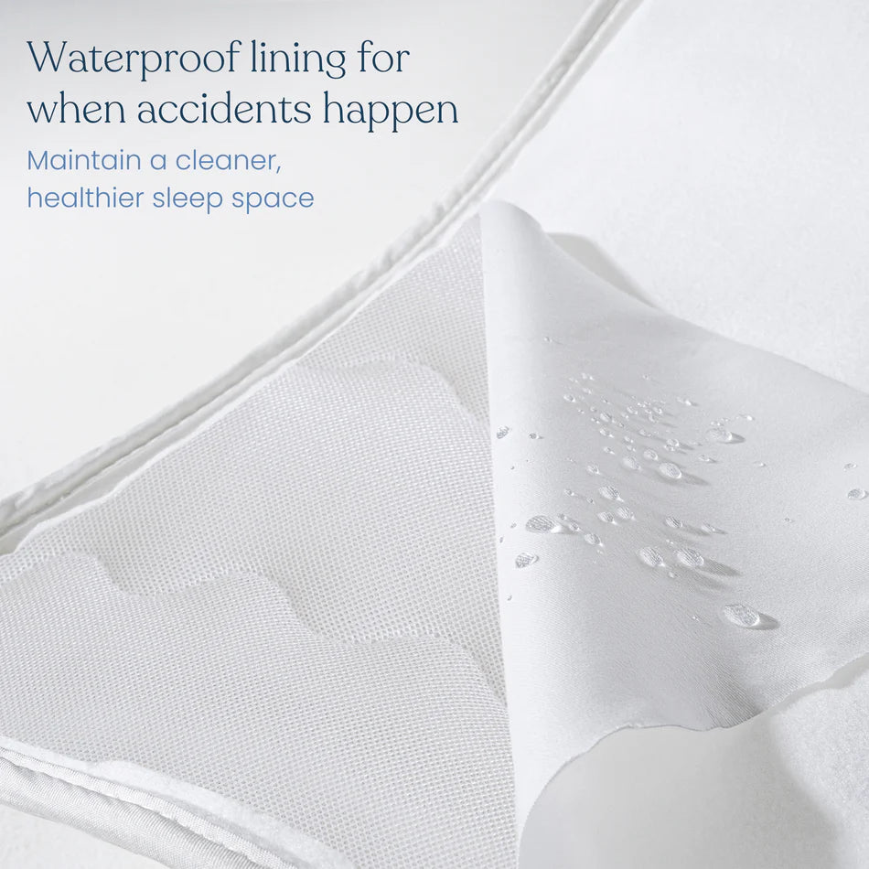 Unlike traditional covers that trap heat or feel plastic-y, our breathable design keeps sleep quiet, comfy, and cool. Andbecause real life is messy, it’s waterproof, machine washable, and dryer safe — so you’ll always have a clean, fresh surface ready.